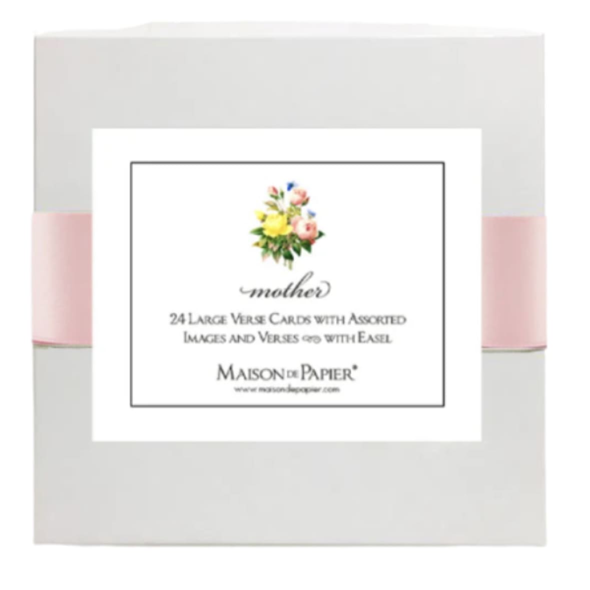 24 oversized verse cards 5.5” x 5.5” with easel by Maison de Papier. 100lb cardstock Each card is printed with a different verse and image. Cards are boxed with a foldable metal easel, and are wrapped with ribbon. Easel styles may vary.