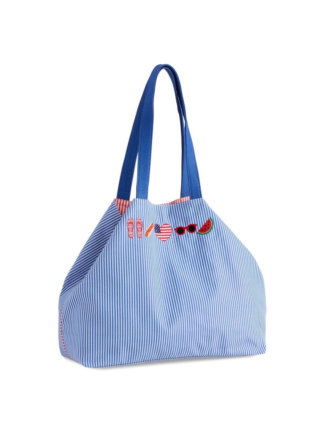 This roomy tote features classic blue-and-white stripes with playful summer-themed embroidery and a vibrant red-striped interior. With double shoulder straps.