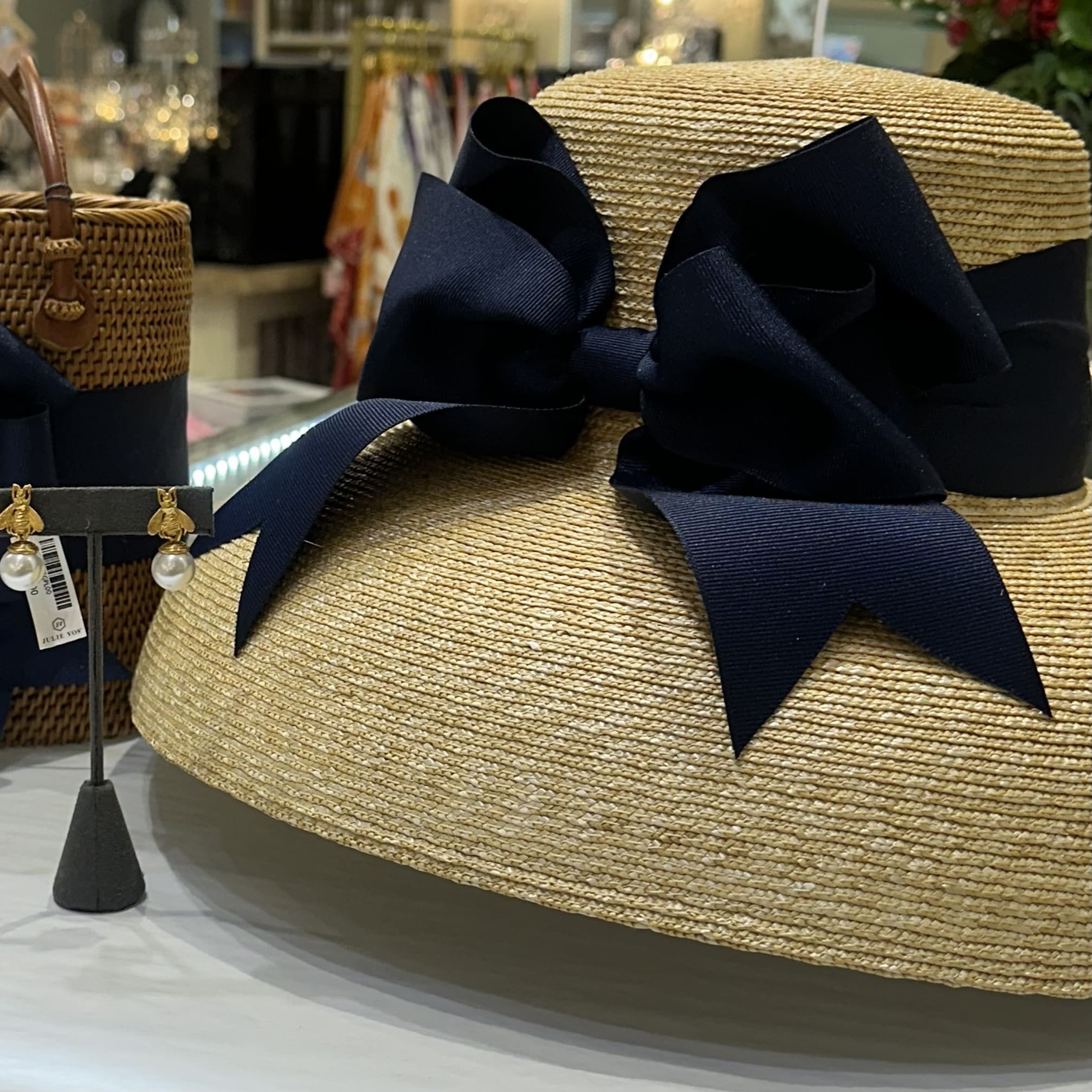A custom sun hat with large downturned brim and custom NAVY ribbon bow that’s perfect for your spring and summer getaways. Handmade and woven with golden wheat straw. We think it’s the perfect hat to complete your look!