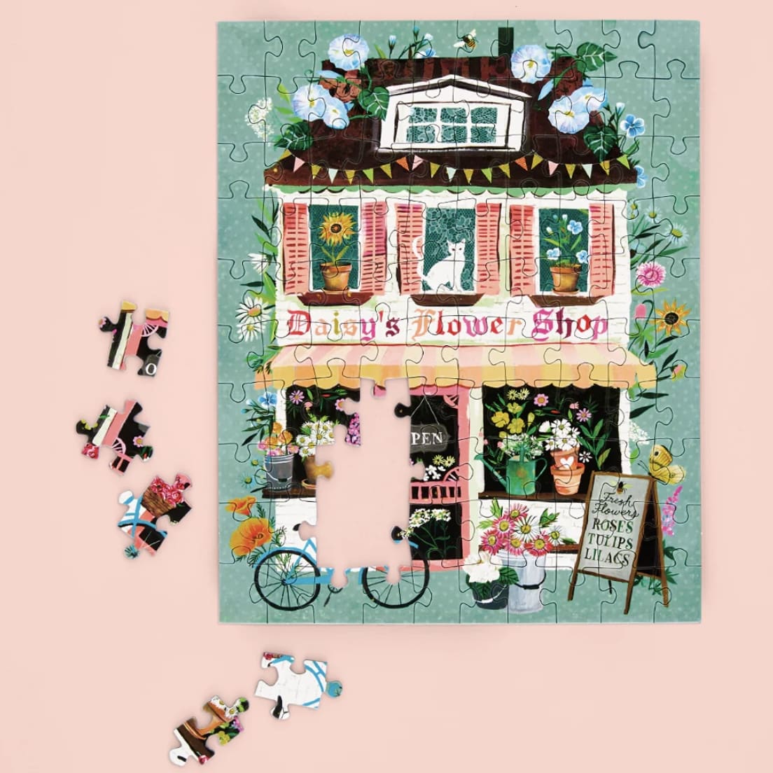 A quaint and picturesque Flower Shop, like you would find in a small town, makes this 100 piece Puzzle Snax a treat to put together.
