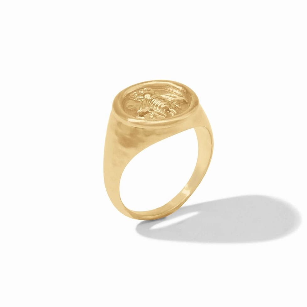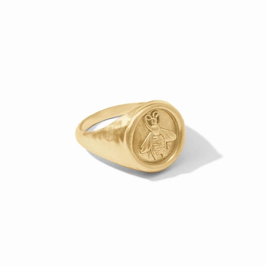 A classic golden signet ring featuring a detailed bee cameo set into a tapering shank.
