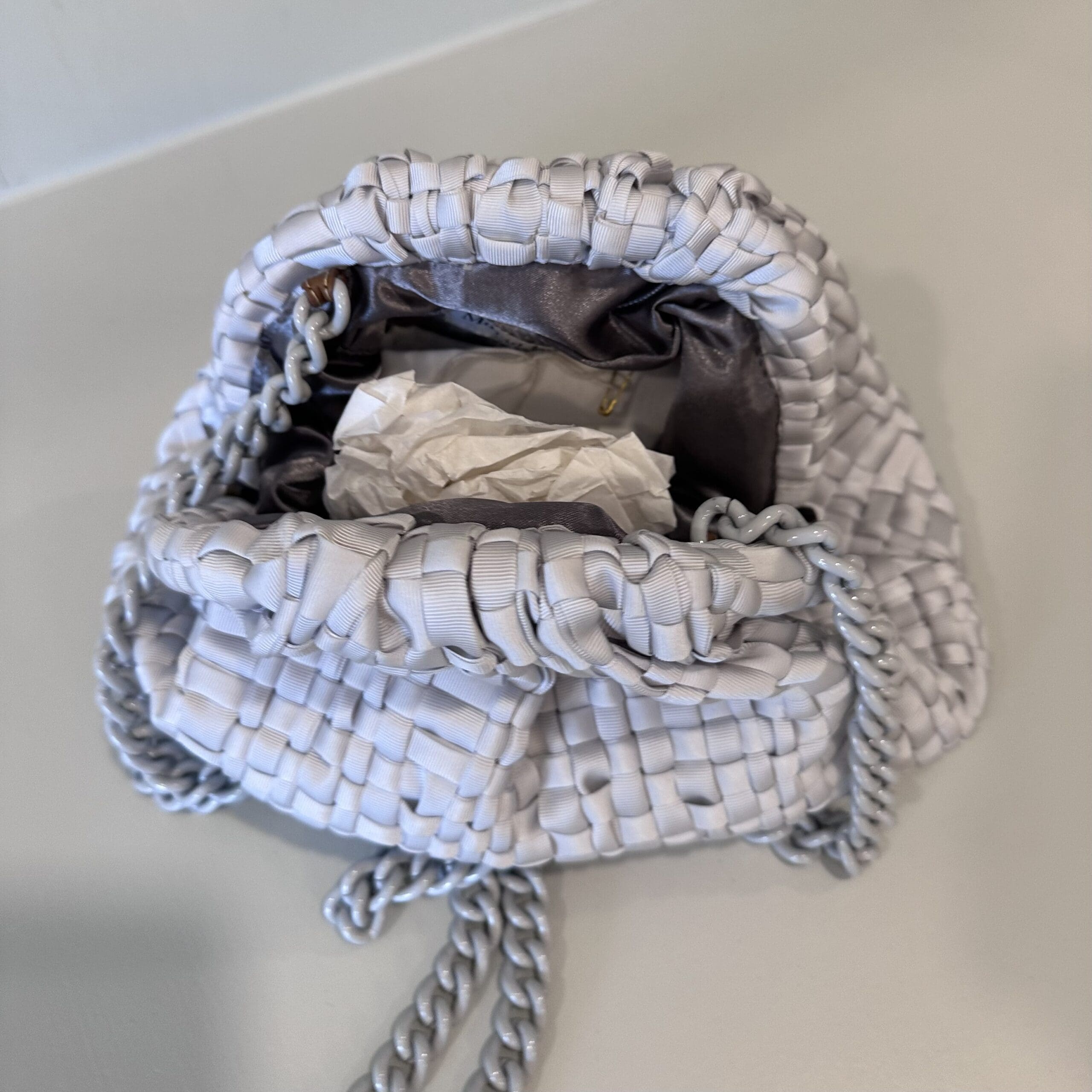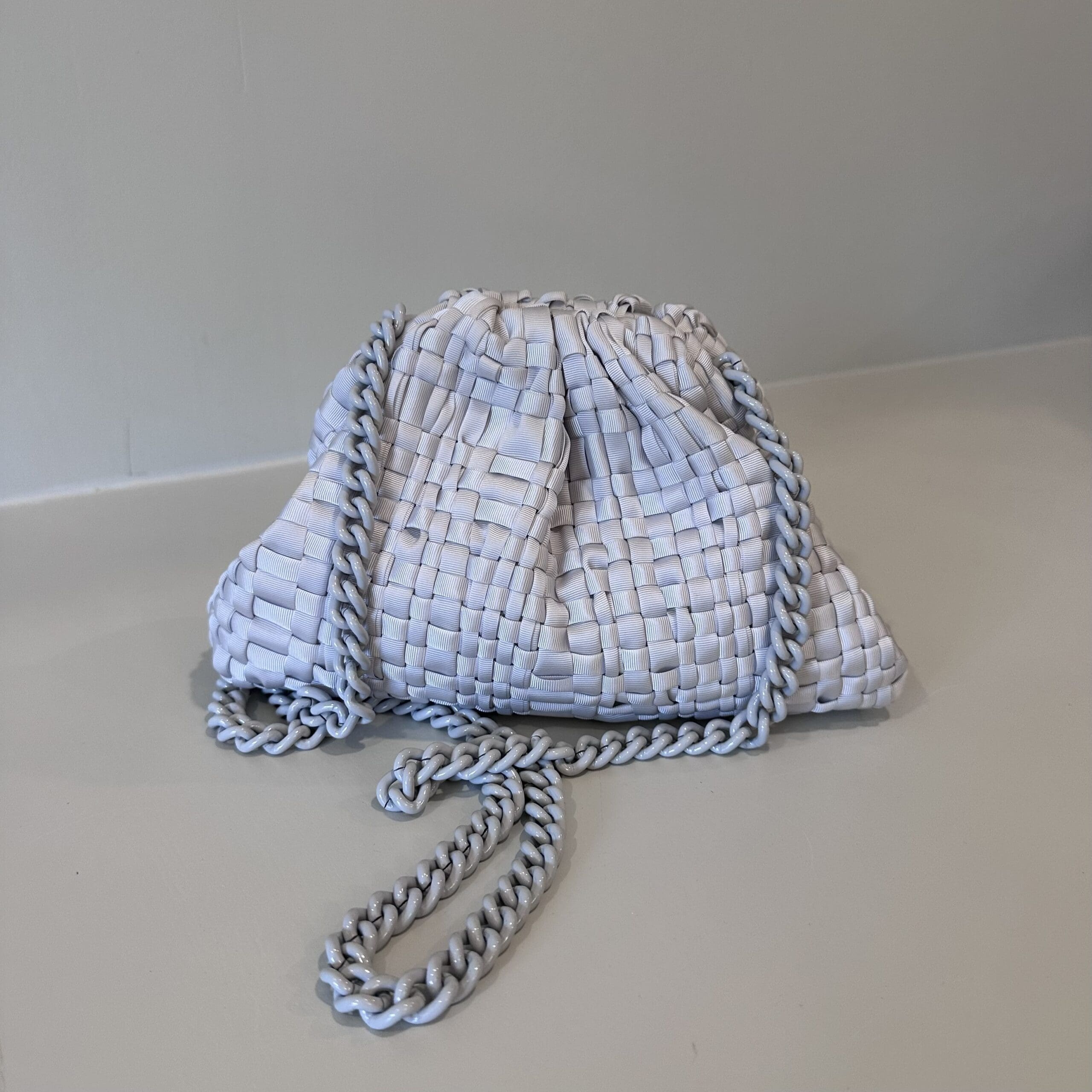 Small women’s clutch in woven ribbon fabric, handmade on ancient looms. This unprecedented reduced version of the Maria La Rosa icon bag is roomy enough to carry the essentials with you. Perfect for all seasons, it is the emblem of a new metropolitan elegance. It is equipped with a ton sur ton chain to wear it even over the shoulder.
