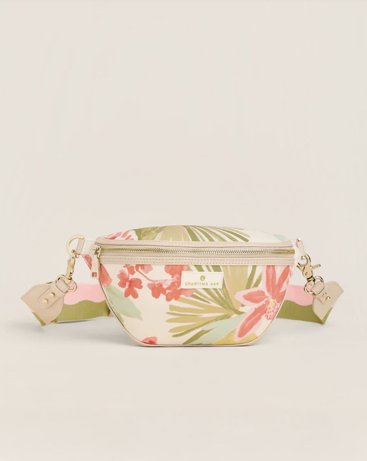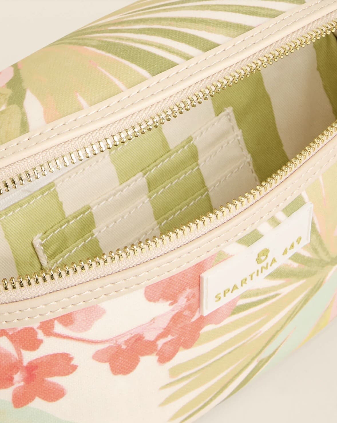 Hands up for hands-free! Our Castillo Tropical Belt Bag is perfect for keeping your goodies secure around your waist or across your chest. A front zip pocket holds your phone, keys, lipstick, and 2 cards (with RFID lining), with a slim pocket on the back. Made with a laminated cotton and linen blend with a custom webbed strap.